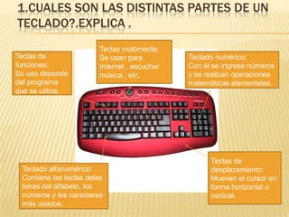 Este documento proporciona una guía sobre las partes principales de una computadora. Explica los diferentes tipos de teclado, mouse, dispositivos de entrada de fotos e ingreso de sonido. También describe los dispositivos visuales como monitores e impresoras, así como las formas en que se almacena y mide la información dentro de una computadora como discos duros, CD, DVD y USB.
