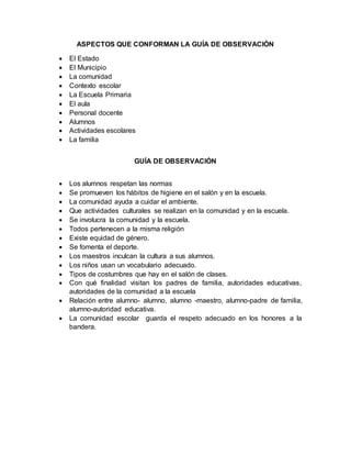 La guía de observación incluye aspectos relacionados con el estado, municipio, comunidad, contexto y escuela primaria para observar el respeto de normas, promoción de hábitos de higiene, actividades culturales, equidad de género, deporte, relaciones entre alumnos y maestros, y el respeto durante los honores a la bandera.