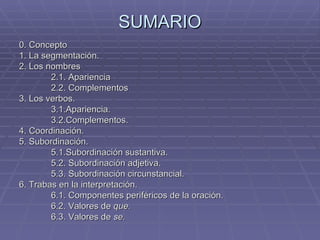 El documento proporciona una guía para el análisis sintáctico de oraciones. Explica cómo segmentar oraciones en grupos nominales y verbales, y describe los diferentes tipos de nombres, verbos, complementos y subordinadas. También cubre temas como la coordinación y los elementos periféricos que pueden dificultar la interpretación sintáctica.