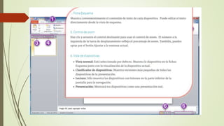 Este documento proporciona una guía sobre las funciones y herramientas principales de Microsoft PowerPoint. Explica los seis componentes del entorno de trabajo de PowerPoint, incluidas las fichas de la cinta, grupos y botones. También describe cómo insertar diapositivas, texto, imágenes y otros elementos. Además, detalla las opciones para aplicar temas, transiciones, animaciones y configurar presentaciones.