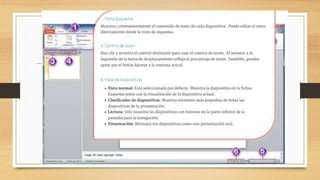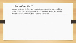 Este documento presenta una guía de PowerPoint creada por tres estudiantes para dos profesores. Explica las seis partes principales del entorno de trabajo de PowerPoint 2010 y proporciona detalles sobre las fichas de la cinta, incluidas Archivo, Inicio, Insertar, Diseño, Transiciones y Animaciones. También cubre temas, diapositivas, notas, capturas de pantalla, reproducción automática, herramientas durante presentaciones y configuración de presentaciones.