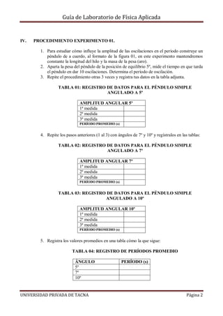 Este documento presenta tres experimentos para estudiar el movimiento armónico simple de un péndulo simple. El primer experimento analiza cómo depende el período de oscilación de la amplitud angular, el segundo experimento estudia la dependencia con la masa y el tercer experimento investiga cómo varía el período con la longitud del péndulo. Los resultados experimentales se comparan con las ecuaciones teóricas para determinar valores como la aceleración de la gravedad.