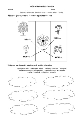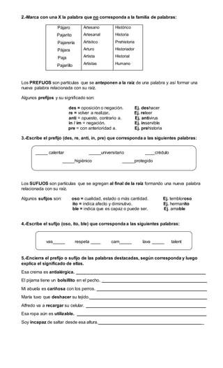 Este documento es una guía para identificar raíces, prefijos y sufijos en palabras. Instruye a los estudiantes a agrupar palabras por familia, identificar la palabra que no pertenece a una familia, y escribir prefijos y sufijos correspondientes a palabras dadas. Explica que los prefijos y sufijos cambian el significado de las palabras al agregarse a la raíz.