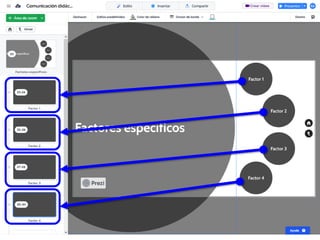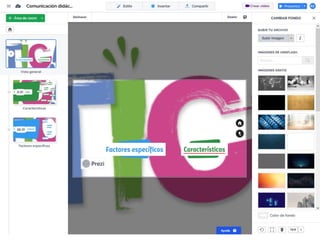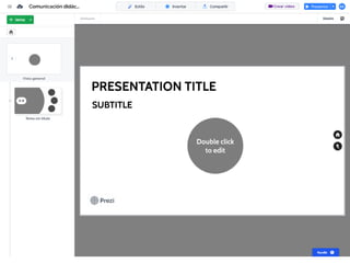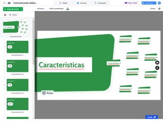Este documento proporciona instrucciones detalladas sobre cómo utilizar la aplicación Prezi para diseñar una presentación de manera organizada en 4 fases: 1) diseñar la estructura con apartados y subapartados, 2) personalizar el diseño, 3) añadir textos, imágenes, vídeos e hipervínculos, y 4) publicar la presentación. Explica los pasos para cada fase como insertar elementos, modificar su diseño y guardar los cambios.