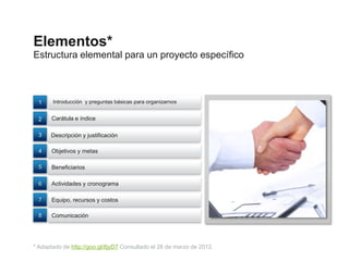 Este documento proporciona una guía para elaborar proyectos específicos. Explica los 12 elementos clave que deben incluirse: 1) introducción, 2) carátula e índice, 3) descripción, 4) justificación, 5) objetivos, 6) metas, 7) beneficiarios, 8) actividades, 9) cronograma, 10) equipo, 11) recursos y 12) comunicaciones. El propósito es brindar una estructura ordenada para definir claramente el problema, solución, objetivos y plan de implementación del proyecto.