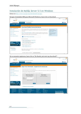 Este documento proporciona instrucciones para instalar MySQL Server 5.5 y MySQL Workbench 5.2 en Windows, y ofrece una guía de los primeros pasos para utilizar estas herramientas, incluyendo cómo crear una conexión al servidor MySQL, importar bases de datos de ejemplo y probar las bases de datos desde MySQL Workbench.