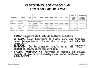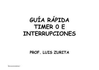 Este documento proporciona una guía rápida sobre el temporizador 0 (TMR0) y sus interrupciones en microcontroladores. Explica los registros asociados a TMR0, cómo funciona como temporizador y contador, cómo se calculan los tiempos de temporización utilizando el prescaler y cómo configurar TMR0 para generar interrupciones periódicas.