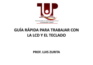 Este documento proporciona una guía rápida para trabajar con una pantalla LCD y un teclado matricial utilizando un PIC16F877. Explica cómo conectar y configurar la LCD y el teclado, inicializarlos, crear mensajes estáticos y dinámicos en la LCD, y leer teclas del teclado para mostrarlas en la LCD. Incluye ejemplos de código para mostrar una tecla leída del teclado 4x3 y 4x4 en la LCD.