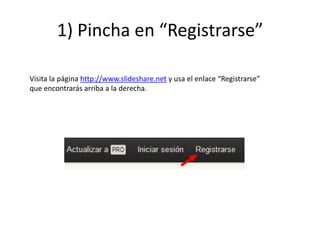 Este documento proporciona una guía básica para usar Slideshare. Explica los pasos para registrarse en el sitio web, subir archivos como presentaciones de PowerPoint, compartirlos incrustándolos en blogs u otras páginas web copiando el código embed, y administrar los archivos subidos.