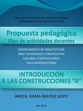 Este documento presenta las pautas para un Trabajo Práctico Único (TPU) que los estudiantes de arquitectura deben realizar sobre su propia vivienda. El TPU tiene como objetivo que los estudiantes analicen su vivienda desde diferentes perspectivas como la estructura, comportamiento térmico e higrotérmico, entre otros. El documento describe cada parte del TPU e incluye instrucciones sobre cómo abordar el análisis estructural, térmico y otros temas a través de planos, cálculos y descripciones.