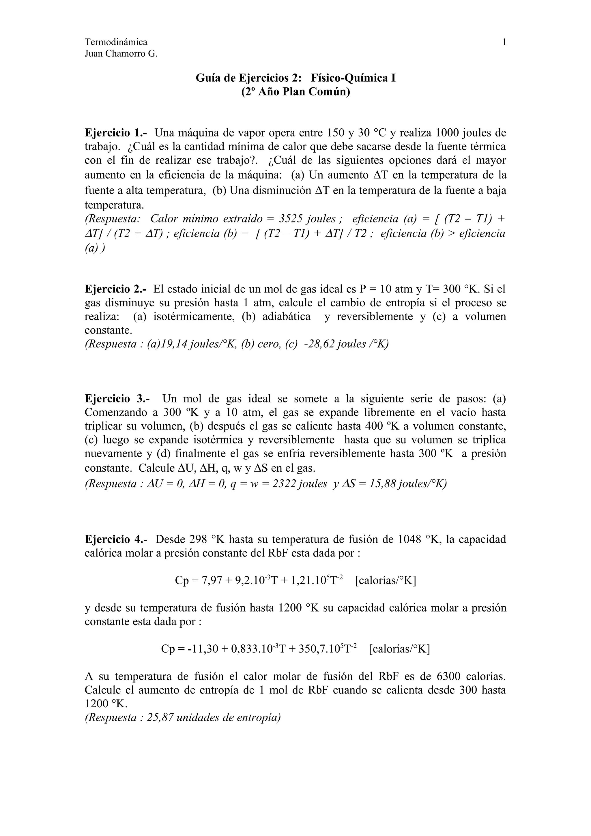 Este documento contiene 12 ejercicios de termodinámica y química física con sus respectivas respuestas. Los ejercicios cubren temas como trabajo, calor, cambios de entropía y energía libre de Gibbs para procesos y reacciones químicas que involucran gases ideales y sustancias en diferentes estados.