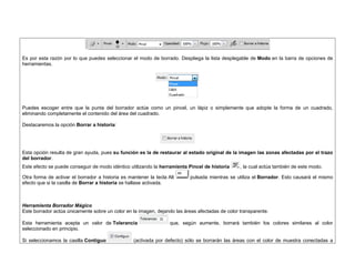 El documento describe las herramientas de edición de fotografías en Photoshop como la varita mágica, el borrador y las herramientas de exposición y saturación. Explica cómo usar estas herramientas para realizar recortes, eliminar partes de una imagen, ajustar la exposición y saturación de zonas seleccionadas. El objetivo es que los estudiantes aprendan a utilizar estas herramientas para crear diseños publicitarios y composiciones fotográficas.