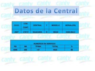 El documento contiene información sobre un equipo central con código 4507, ubicado en Guacara, modelo NEAX con números de serie 0245-564,5 y 4161V. También incluye estadísticas de líneas en servicio, con 4096 líneas residenciales, 686 no residenciales y 147 trunks/máquinas, para un total de 4929 líneas funcionando, que representan el 98% del total.