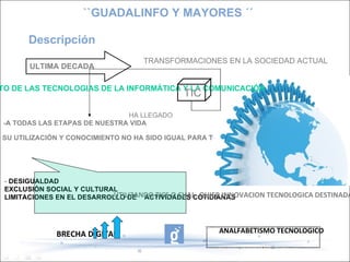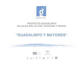 Este documento describe el proyecto "Guadalinfo y Mayores" que busca preparar a personas mayores con déficit tecnológico y comunicativo para participar en la sociedad de la información. El proyecto se llevará a cabo en los centros de adultos de Chucena, Nerva y Villalba del Alcor e involucrará asociaciones, escuelas de adultos y hogares de pensionistas. El objetivo es brindar formación básica en hardware, software, internet y herramientas digitales para promover el desarrollo personal y la comunicación. El