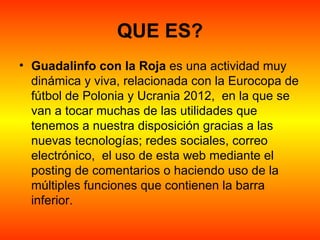 Este documento describe un proyecto llamado "Guadalinfo con la Roja" relacionado con la Eurocopa de fútbol de 2012. El proyecto consiste en un sistema de clasificación para los usuarios de centros Guadalinfo basado en sus predicciones sobre los resultados de los partidos y el resultado final del torneo, con puntos otorgados por aciertos.