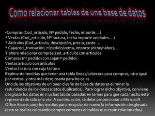 Este documento describe cómo diseñar una base de datos para gestionar compras, ventas, artículos y caja. Recomienda desglosar la información en múltiples tablas relacionadas para eliminar redundancias, incluyendo tablas separadas para líneas/encabezados de compras y ventas, y otra para transacciones de caja. El objetivo es representar cada dato una sola vez y permitir a Access recopilar la información desglosada a través de campos comunes en tablas relacionadas.