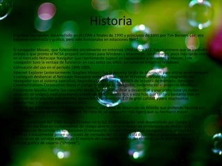 Los navegadores web más populares son Google Chrome, Firefox, Safari e Internet Explorer. El primer navegador fue desarrollado en el CERN a finales de los años 90. Mosaic y luego Netscape Navigator fueron populares en los años 90, hasta que Internet Explorer dominó el mercado de Windows. Firefox fue desarrollado por Mozilla y se convirtió en un navegador popular. Google lanzó Chrome en 2008, que ahora tiene la mayor cuota de mercado.