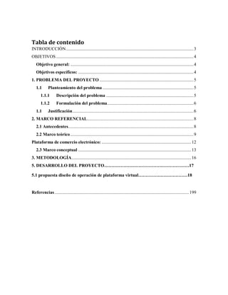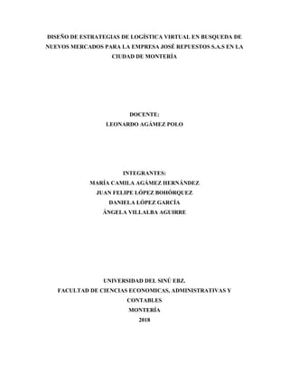 Este documento propone diseñar estrategias de logística virtual para la empresa José Repuestos S.A.S. con el objetivo de buscar nuevos mercados. Presenta los objetivos del proyecto, realiza una revisión de literatura sobre logística virtual y comercio electrónico, y describe la metodología y desarrollo del proyecto, incluyendo la propuesta de diseñar una plataforma virtual de comercio electrónico para la empresa.