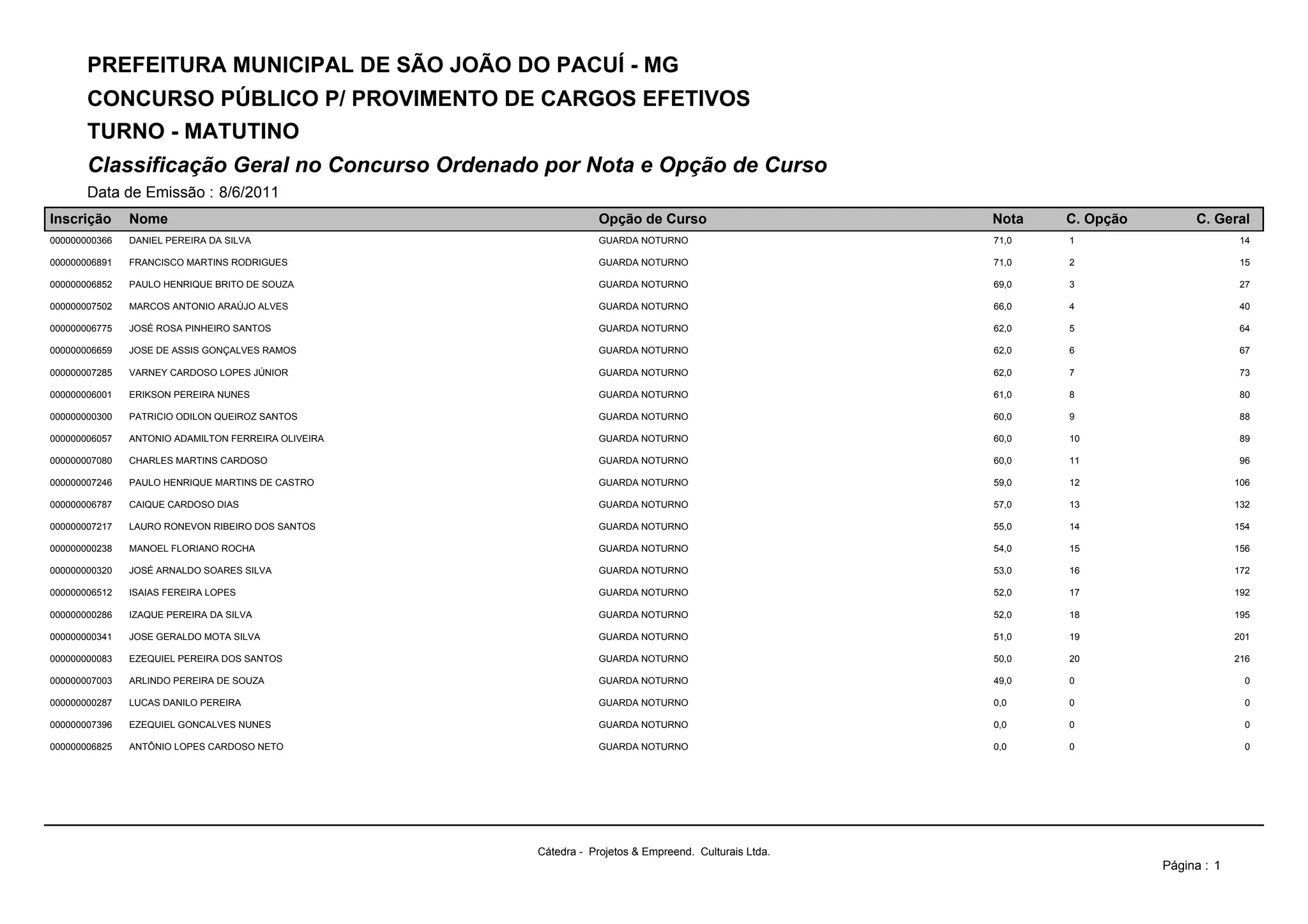 Este documento presenta los resultados de un concurso público para el cargo de guardia nocturno en la municipalidad de São João do Pacuí, MG, Brasil. Los candidatos están ordenados por nota y opción de curso. Daniel Pereira da Silva obtuvo la nota más alta (71,0) y la posición número 14 en la clasificación general. En total, 21 candidatos compitieron para los 10 puestos disponibles de guardia nocturno.
