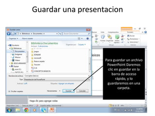 Este documento proporciona instrucciones sobre cómo guardar presentaciones de PowerPoint de diferentes maneras, incluyendo guardar en una carpeta, guardar como página web HTML, y configurar el guardado automático. Se explica que para guardar en una carpeta se debe hacer clic en "Guardar" en la barra de acceso rápido, y para guardar como página web HTML se hace clic en "Guardar como" y se selecciona el tipo "Página web". También se indica que para configurar el guardado automático se debe hacer clic en "Opc