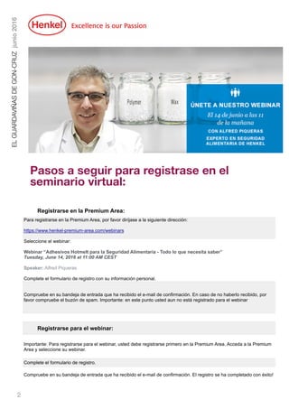Este documento presenta un seminario web sobre adhesivos hotmelt para la seguridad alimentaria. Explica los pasos para registrarse en el seminario virtual y resume los temas que se abordarán, incluyendo la migración de sustancias desde el embalaje a los alimentos, el uso de barreras en los materiales de embalaje, la normativa europea relevante y los análisis requeridos para evaluar las materias primas de los adhesivos.
