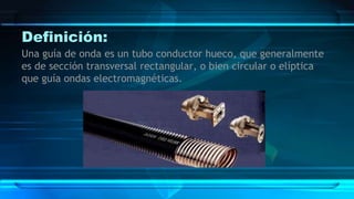 Una guía de onda es un tubo conductor hueco que guía ondas electromagnéticas a lo largo de su interior. Las primeras guías de onda fueron propuestas por Joseph John Thomson en 1893 y verificadas experimentalmente por O. J. Lodge en 1894. Las guías de onda confinan la energía electromagnética a lo largo del tubo mediante la reflexión de las paredes conductoras, lo que permite transmitir señales con bajas pérdidas. Actualmente, las fibras ópticas, que son guías de onda dieléctricas,