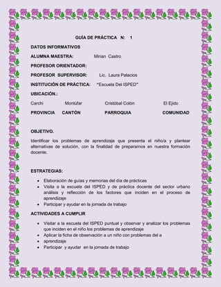 Este documento presenta dos guías de práctica de una alumna maestra en dos escuelas diferentes. En cada guía, la alumna describe las actividades realizadas como visitar la escuela, observar a un niño y aplicar una ficha de observación para identificar problemas de aprendizaje. La ficha de observación incluye varias categorías como cognitivo, motriz, lenguaje, cálculo y emocional para analizar las dificultades del niño.