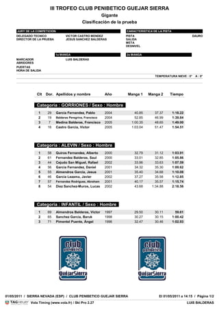 Este documento presenta los resultados de varias categorías en el III Trofeo Club Penibético Guejar Sierra celebrado el 1 de mayo de 2011. Proporciona detalles sobre el jurado, la pista y las condiciones meteorológicas, así como los tiempos y clasificaciones de cada competidor en las diferentes categorías masculinas y femeninas.