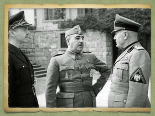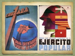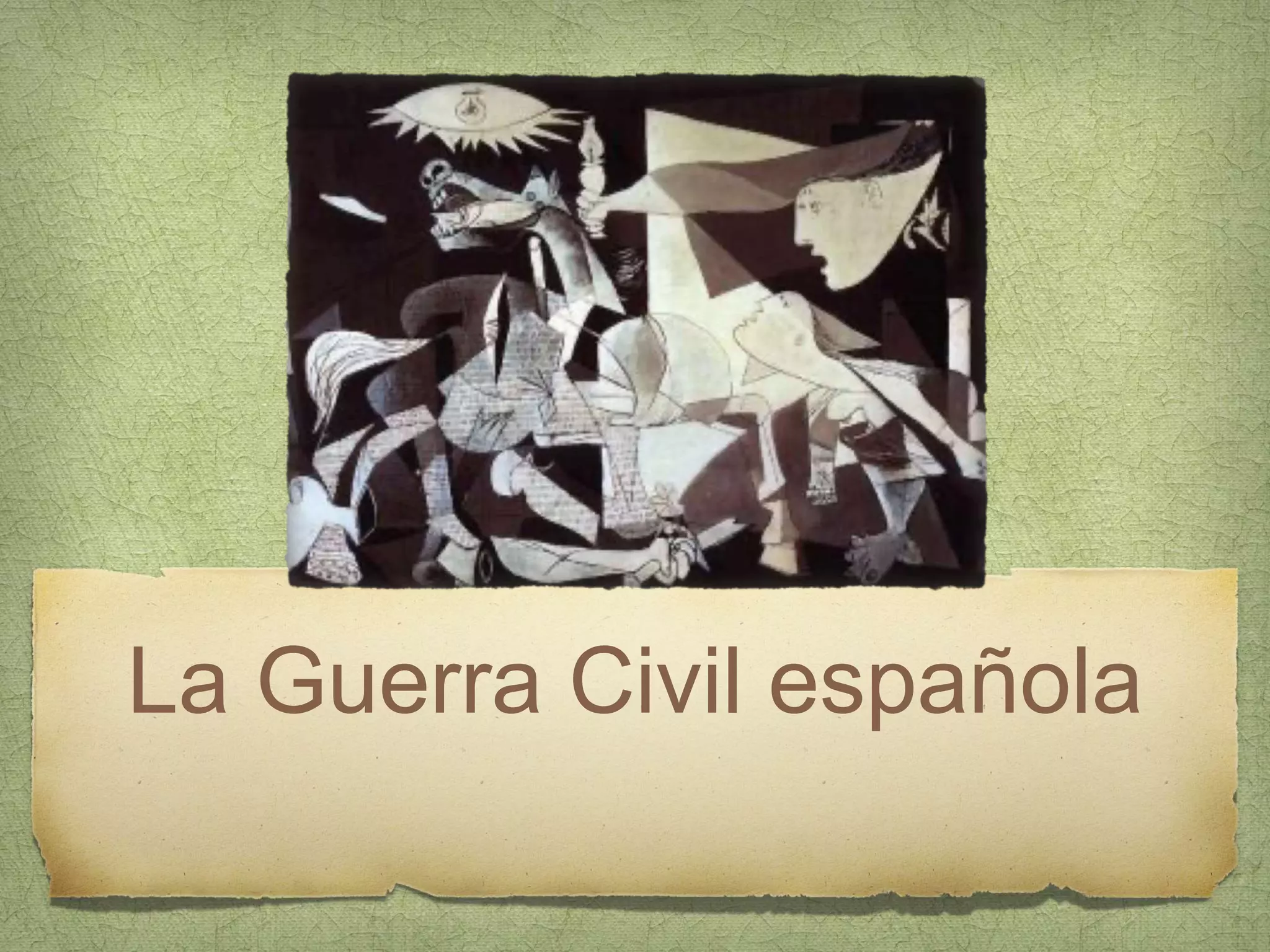 La Guerra Civil Española comenzó en julio de 1936 cuando un grupo de militares se sublevó contra el gobierno de la Segunda República, liderados por el general Franco. Aunque el levantamiento triunfó en el norte y sur de España, fracasó en el centro y este, dando inicio a una larga guerra civil de tres años. El conflicto dividió a España en dos bandos, el republicano que defendía al gobierno legítimo y el sublevado que tomó el nombre de nacional y estuvo dirigido por Franco. Finalmente, en ab