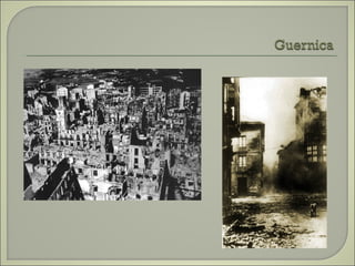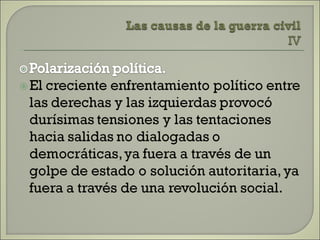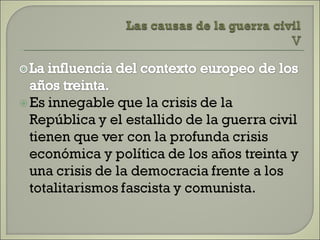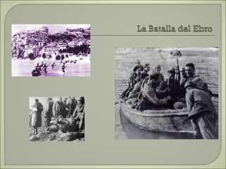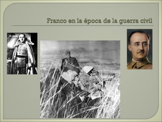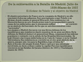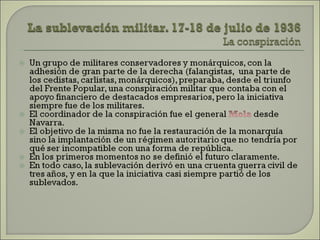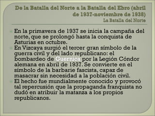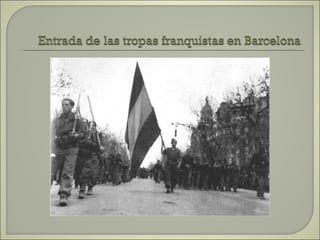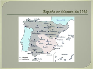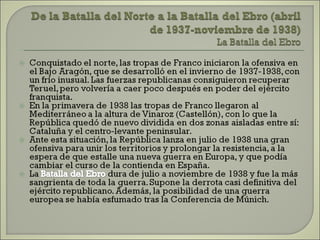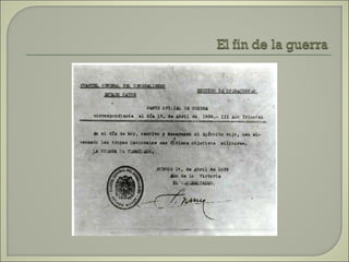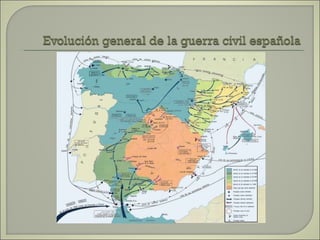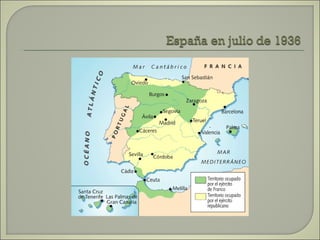 Este documento resume las principales etapas de la Guerra Civil Española desde el inicio de la sublevación militar el 17 de julio de 1936 hasta la victoria final de Franco en abril de 1939. Describe los primeros éxitos del bando sublevado, la resistencia republicana en el norte y centro del país, las grandes batallas como la de Madrid y Guadalajara, la ofensiva sobre Cataluña y la toma final de Madrid que puso fin a la guerra. Resalta el papel clave del ejército de África de Franco y la intervención milit
