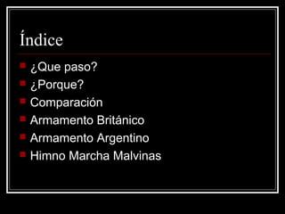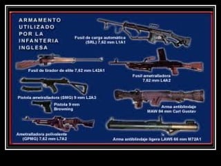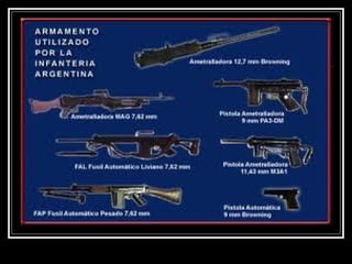 El documento describe la Guerra de Malvinas de 1982, incluyendo que el 2 de abril de 1982 las fuerzas argentinas invadieron las islas Malvinas, que estaban bajo control británico, debido a que la dictadura argentina quería afirmar su soberanía sobre los archipiélagos del sur. También proporciona detalles sobre el armamento británico y argentino utilizado en la guerra, así como sobre el himno "Marcha a Malvinas" escrito en honor a los soldados argentinos que lucharon.