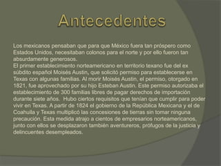 El gobierno mexicano otorgó generosas concesiones de tierras en Texas para atraer colonos y promover el desarrollo económico. Sin embargo, las restricciones sobre los colonos se ignoraron y Texas se llenó de estadounidenses. Esto amenazó el control mexicano, llevando a los texanos a declarar su independencia en 1836 después de que Santa Anna enviara tropas para sofocar la rebelión. Los texanos pidieron ayuda a Estados Unidos y derrotaron a Santa Anna en la batalla de San Jacinto, forzando