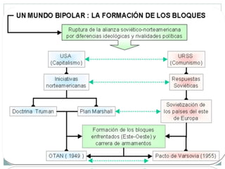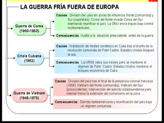 La Guerra Fría fue un período de tensión entre 1947-1991 entre las dos superpotencias de la época, Estados Unidos y la Unión Soviética, que representaban modelos ideológicos opuestos. Se caracterizó por la conformación de un orden mundial bipolar, la carrera armamentista y la tensión nuclear constante. Finalmente terminó con la caída del Muro de Berlín en 1989 y la desintegración de la Unión Soviética en 1991.
