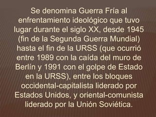 El documento describe la Guerra Fría, el enfrentamiento ideológico entre los bloques capitalista y comunista desde 1945 hasta 1991. Tuvo lugar a nivel político, ideológico y militar entre Estados Unidos y la OTAN versus la Unión Soviética y sus aliados. Aunque no hubo combates directos, las tensiones aumentaron por la desconfianza mutua y la carrera armamentista entre las superpotencias.