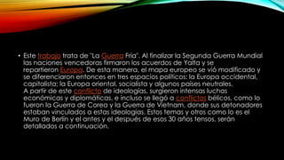 La Guerra Fría surgió tras la Segunda Guerra Mundial debido a las diferencias ideológicas entre Estados Unidos y la Unión Soviética. Esto llevó a la división de Europa en bloques capitalista y comunista, generando intensas rivalidades políticas y económicas entre ambas superpotencias a lo largo de las décadas siguientes.