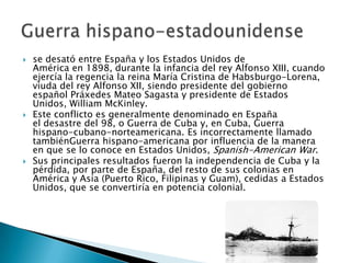 El documento resume el Desastre del 98, la guerra entre España y Estados Unidos que resultó en la pérdida de las últimas colonias españolas. Estados Unidos intervino en la guerra de independencia cubana y derrotó a la flota española, obteniendo la cesión de Puerto Rico, Filipinas y Guam. España también perdió otras posesiones en Asia, que fueron vendidas a Alemania.