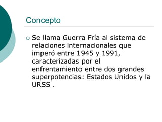 La Guerra Fría fue el período de enfrentamiento entre 1945-1991 entre las dos superpotencias Estados Unidos y la Unión Soviética. Se caracterizó por la competencia militar, la carrera armamentística nuclear, y la lucha ideológica entre el capitalismo y el comunismo que llevó a crisis como la de Berlín y Cuba. Finalmente, la Guerra Fría terminó con el colapso de la Unión Soviética.