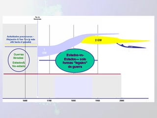 El documento aborda el concepto de guerras de cuarta generación (4GW), destacando la pérdida del monopolio de la guerra por parte de los Estados-nación y la emergencia de actores no estatales como redes ideológicas que utilizan la violencia. Se analiza cómo estas guerras difuminan barreras entre militares y civiles, así como la influencia del terrorismo en este contexto. Finalmente, se menciona el papel de Al-Qaeda y otros grupos en el desarrollo de estrategias que se adaptan a este nuevo paradigma de conflicto.