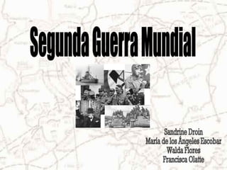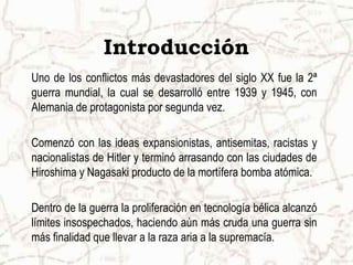 La Segunda Guerra Mundial se desarrolló entre 1939 y 1945, comenzó con las ideas expansionistas de Hitler y terminó con la bomba atómica en Japón. Fue uno de los conflictos más devastadores del siglo XX que dejó millones de muertos y una gran destrucción. Las causas incluyeron el resentimiento alemán por el Tratado de Versalles, el ascenso de regímenes totalitarios como el nazismo en Alemania e Italia, y la invasión de países como Polonia y la Unión Soviética.