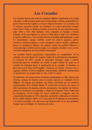 Las cruzadas fueron una serie de campañas militares iniciadas en 1095 por el papa Urbano II con el objetivo de recuperar Tierra Santa de manos musulmanas. Se libraron durante casi dos siglos entre cristianos europeos y musulmanes por el control de territorios en Oriente Próximo y la península ibérica. Aunque motivadas principalmente por la religión, las cruzadas también tuvieron efectos sociales, económicos, políticos y culturales en Europa y el mundo islámico.