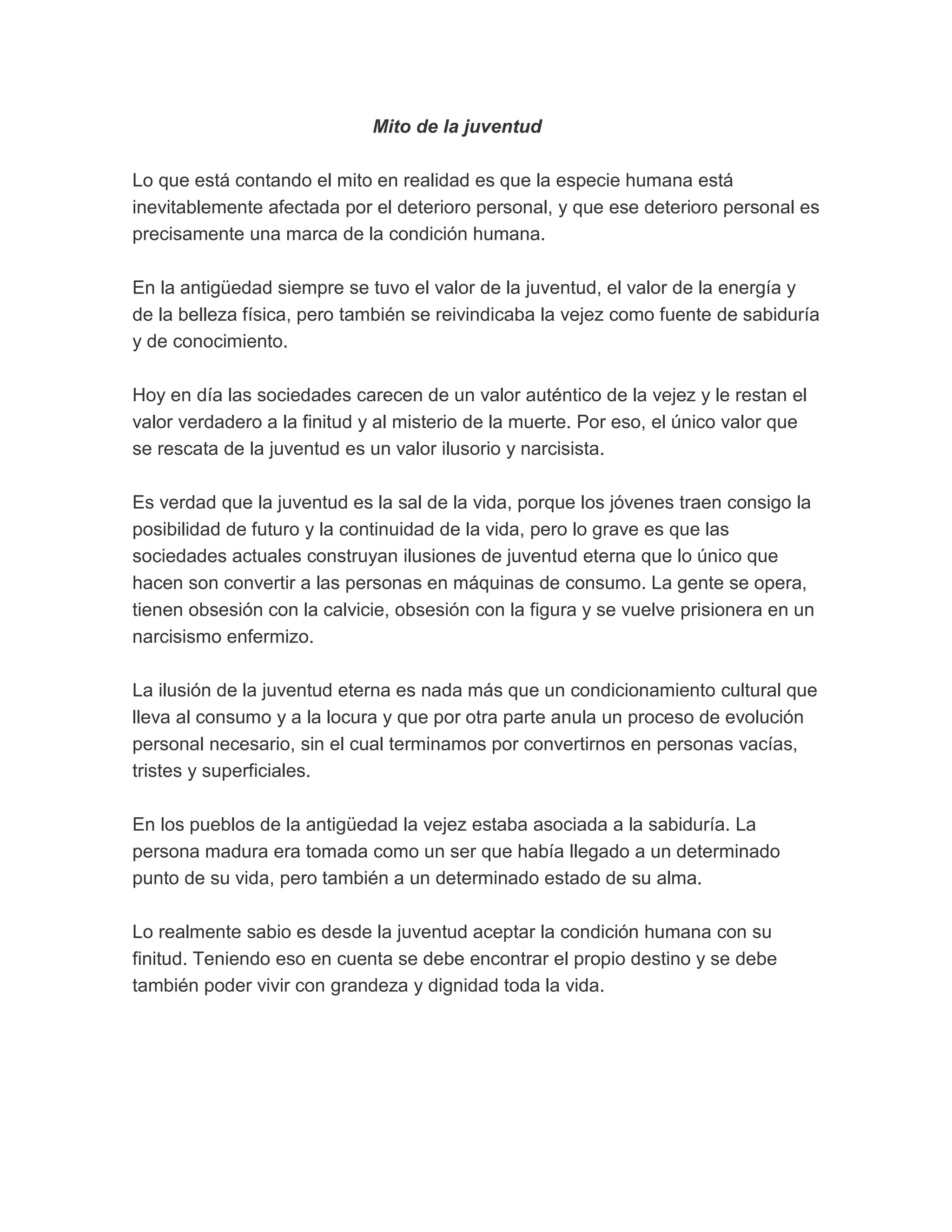 La juventud es valorada por su energía y belleza física, mientras que la vejez es asociada con la sabiduría. Sin embargo, las sociedades modernas carecen de un valor auténtico de la vejez y promueven una ilusión de juventud eterna que lleva al consumismo y narcisismo. Lo verdaderamente sabio es aceptar la condición humana de envejecimiento y finitud desde la juventud para vivir con propósito y dignidad a lo largo de toda la vida.