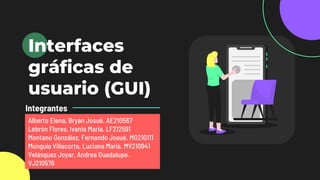Este documento describe las interfaces gráficas de usuario (GUI), incluyendo su definición, componentes principales, requisitos de diseño y tipos de interfaces de usuario. Una GUI facilita la comunicación entre el usuario y un programa a través de elementos gráficos como íconos. Debe mantener la simplicidad y consistencia para que sea fácil de usar. Los tipos de interfaces incluyen CLI (línea de comandos), GUI (gráfica) y NUI (natural).
