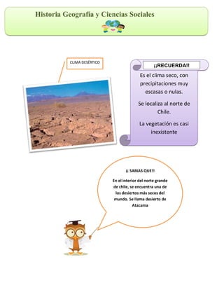 Este documento presenta información sobre los diferentes tipos de climas en Chile. Explica que existen cuatro zonas climáticas principales: desértico, semidesértico, mediterráneo y climas fríos. Para cada zona describe sus características, como la vegetación, fauna y actividades humanas típicas. También incluye preguntas y actividades para los estudiantes.
