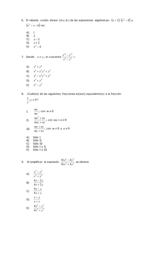 3. El documento proporciona una guía sobre conceptos básicos de álgebra como parte de un examen o evaluación.