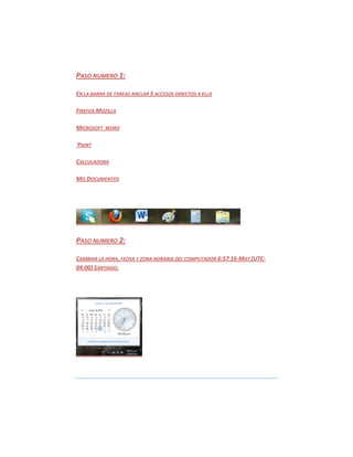 El documento proporciona instrucciones en 4 pasos para personalizar la barra de tareas en Windows: 1) agregar 5 accesos directos fijos, 2) cambiar la configuración de hora y fecha, 3) abrir 10 documentos de Word para ver el agrupamiento, y 4) ampliar el tamaño de los iconos.