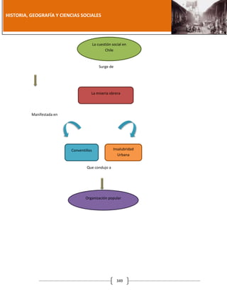 Este documento presenta una guía de contenidos para estudiantes de segundo medio sobre la cuestión social en Chile. La guía explica que la cuestión social surgió de la miseria obrera manifestada en conventillos y la insalubridad urbana, lo que condujo a la organización popular. El objetivo es conocer cómo se desarrolló este proceso y cómo influyó en la construcción histórica del país.
