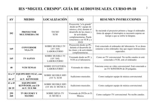 Este documento proporciona una guía de los equipos audiovisuales disponibles en el IES "Miguel Crespo" durante el curso 09-10. Incluye una lista de los dispositivos, su localización y breves instrucciones sobre su uso, como televisores, reproductores de DVD, cámaras, proyectores y equipos de música para visión de vídeos y presentaciones en diferentes aulas y salas del centro.