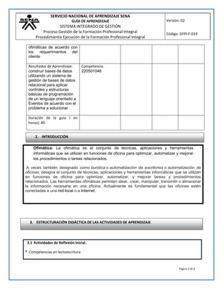 Este documento presenta una guía de aprendizaje para un curso de formación profesional en sistemas SAPUYES. La guía describe las actividades planeadas para la primera semana del curso, incluyendo clases magistrales, talleres prácticos y ejercicios sobre herramientas ofimáticas como Microsoft Word. El objetivo es que los estudiantes aprendan conceptos básicos y habilidades prácticas relacionadas con el uso de herramientas de oficina.