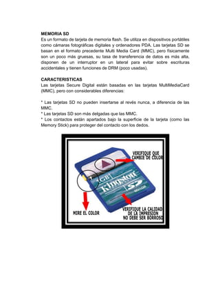 El documento describe varios periféricos de entrada y salida para computadoras. Entre los periféricos de entrada se incluyen memorias USB, tarjetas SD, cámaras web, micrófonos, escáneres, lápices ópticos, teclados, mouse y joysticks. Los periféricos de salida mencionados son monitores e impresoras. Cada periférico describe sus características principales.