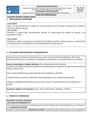 Este documento presenta una guía de aprendizaje para estudiantes de noveno grado sobre el análisis de circuitos eléctricos. La guía incluye cinco actividades de aprendizaje que cubren temas como la definición y clasificación de máquinas eléctricas, la conexión de máquinas eléctricas y el cálculo de un transformador. Cada actividad implica copiar lecturas, identificar palabras desconocidas, ver videos, redactar resúmenes y participar en debates grupales sobre los temas. La gu
